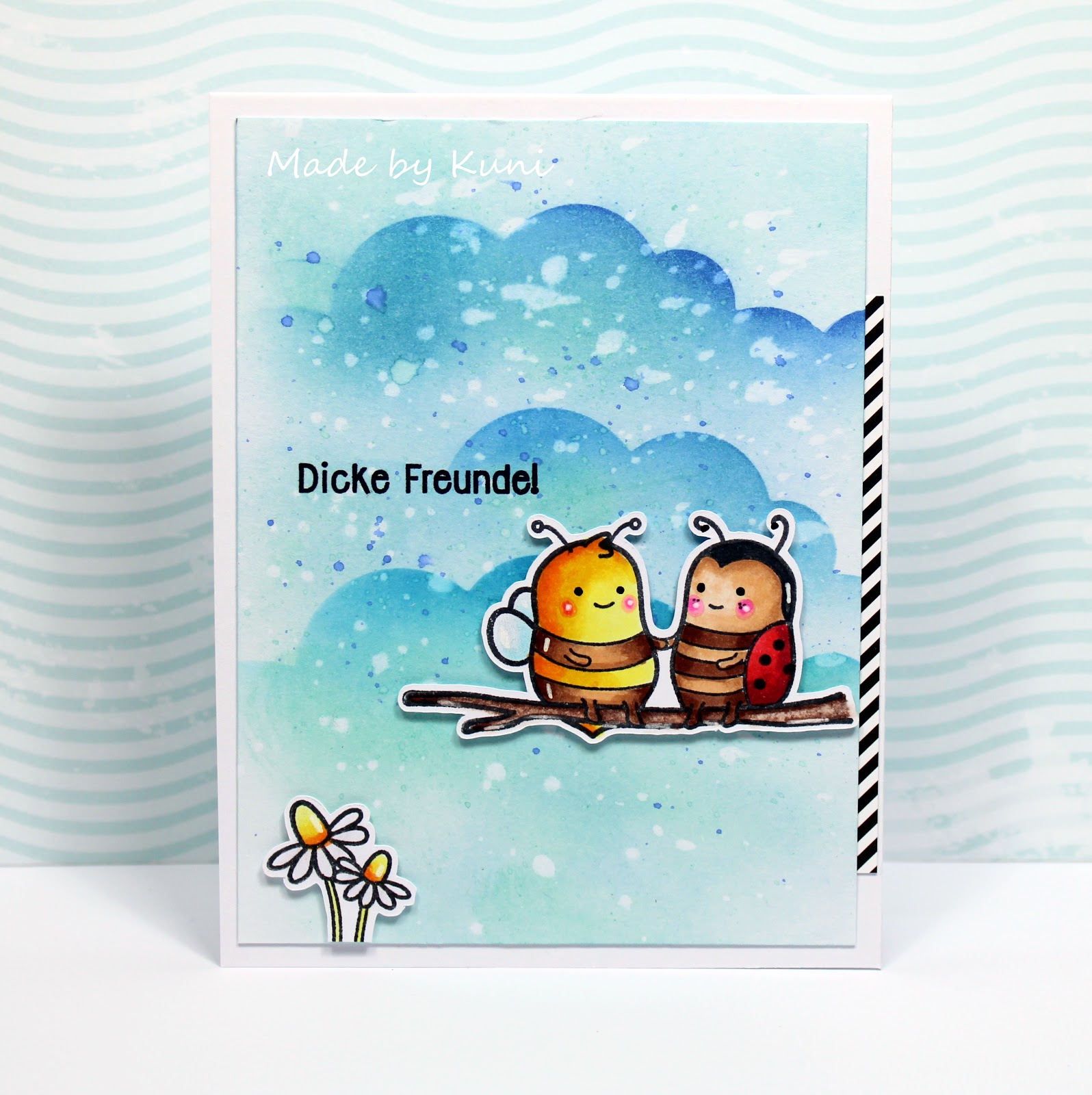 Coloriert habe ich mit Copics und der Hintergrund ist mit Distress Oxiden und einer Wolkenschablone gestaltet.
